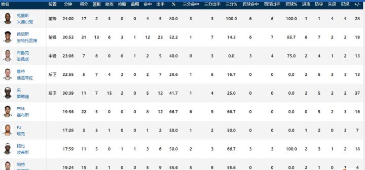 球员数据:字母哥拿到全场最高的31分外加13篮板,福布斯命中6记三分,拿到22分,米德尔顿17分,霍乐迪也拿到11分15助攻的两双数据。热火队这边,戴德蒙19分9篮板,德拉季奇18分,阿德巴约16分,巴特勒10分。