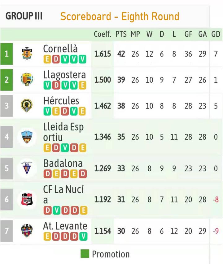 上周末,西乙B联赛第二阶段保级区的比赛率先完结,各组的升降级球队都已确定。莱里达队1-1战平拉努西亚,以小组第四的成绩结束本赛季,下赛季将继续在西乙B征战(下赛季西乙B改名为西班牙足协乙级联赛)。