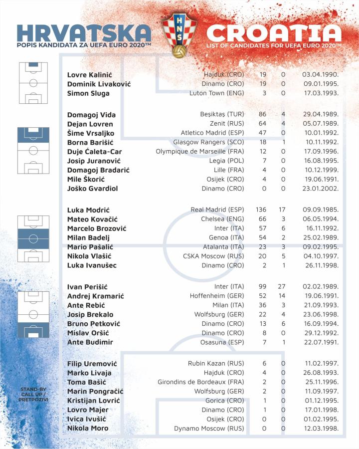 中场:莫德里奇(皇家马德里)、科瓦契奇(切尔西)、布罗佐维奇(国际米兰)、巴德利(热那亚)、帕萨利奇(亚特兰大)、弗拉西奇(莫斯科中央陆军)、伊万努舍茨(萨格勒布迪纳摩)