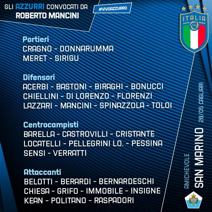 前锋:贝洛蒂(都灵)、贝拉尔迪(萨索洛)、贝尔纳代斯基(尤文图斯)、基耶萨(尤文图斯)、格里福(弗莱堡)、因莫比莱(拉齐奥)、因西涅(那不勒斯)、基恩(巴黎圣日耳曼)、波利塔诺(那不勒斯)、拉斯帕多里(萨索洛)