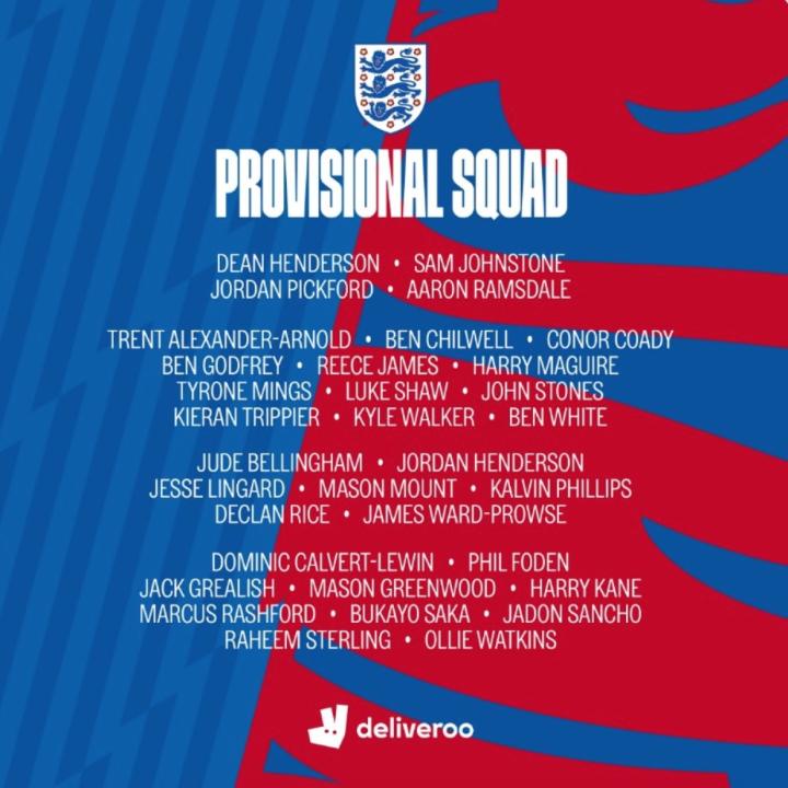 前场:勒温(埃弗顿)、福登(曼城)、格拉利什(阿斯顿维拉)、格林伍德(曼联)、凯恩(热刺)、拉什福德(曼联)、萨卡(阿森纳)、桑乔(多特蒙德)、斯特林(曼城)、沃特金斯(阿斯顿维拉)