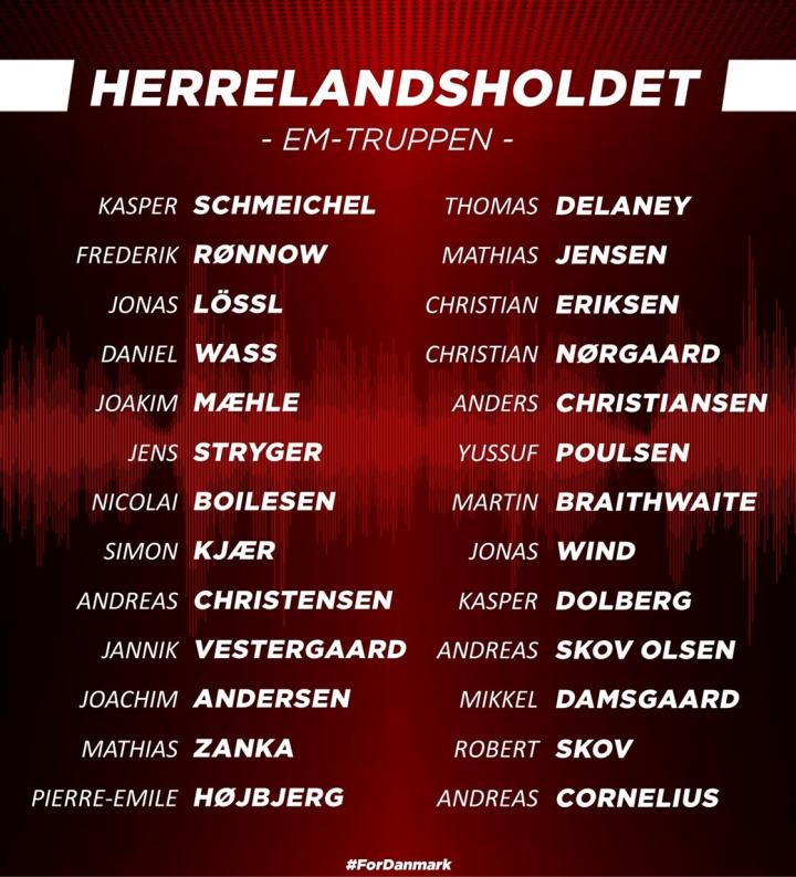 前锋:波尔森(RB莱比锡)、布莱斯维特(巴塞罗那)、温德(哥本哈根)、多尔贝格(尼斯)、奥尔森(博洛尼亚)、达姆斯高(桑普多利亚)、斯科夫(霍芬海姆)、科内柳斯(帕尔马)