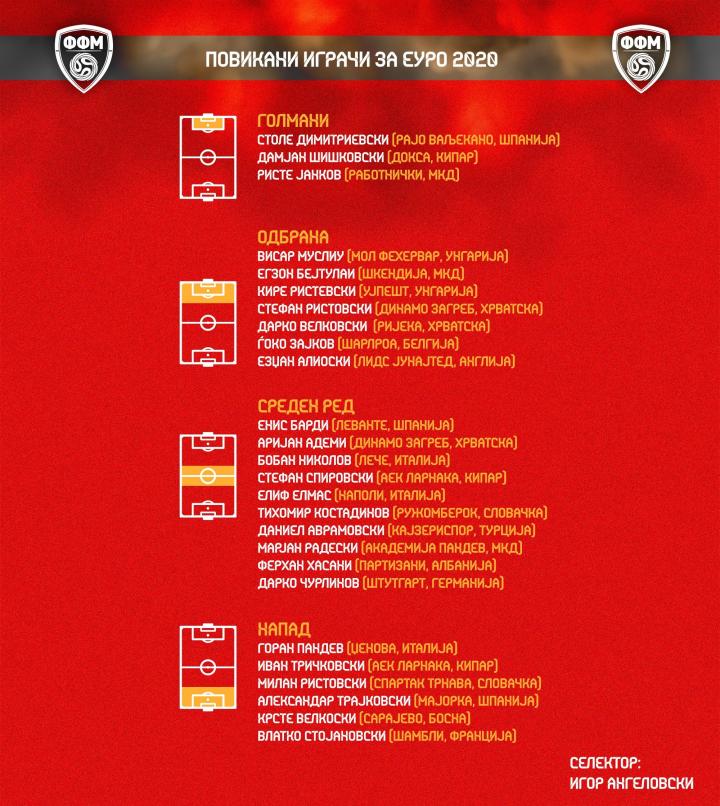 前锋:潘德夫(热那亚)、特拉伊科夫斯基(马略卡)、特里茨科夫斯基(AEK拉纳卡)、斯托扬诺夫斯基(尚布利)、维尔科斯基(萨拉热窝)、里斯托夫斯基(特纳瓦斯巴达)