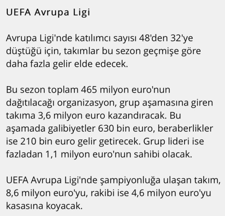 随着欧联杯小组赛球队从48支减少到32支,下赛季小组赛参赛球队将获得比上赛季更多的收益。总奖金为4.65亿欧元,小组赛参赛队将分别获得360万欧元的奖金。小组赛获胜时可以得到63万欧元,平局时得到21万欧元。 小组第一的球队将获得110万欧元的额外收益,欧联杯亚军将获得奖金460万欧元,冠军将获得奖金860万欧元。