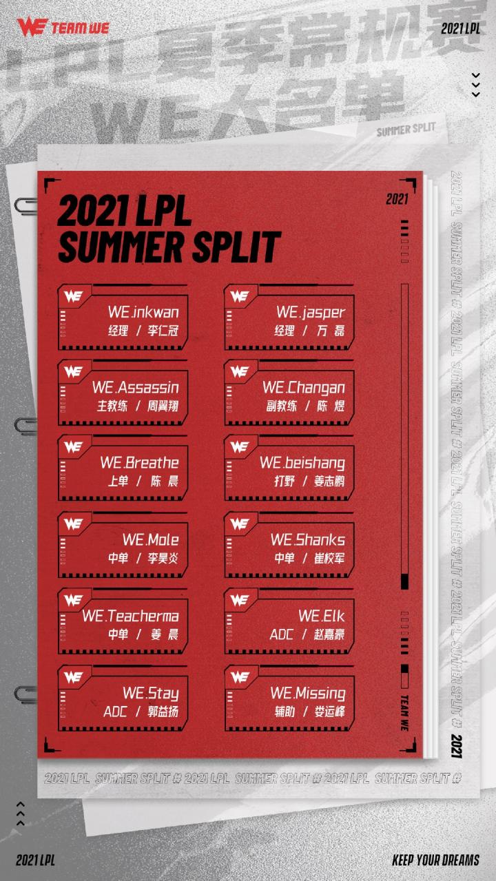 峡谷全视野WE官博:在春季赛休赛期期间,我们积极筹备补强事宜,对春季赛存在的问题做出针对性方案进行优化解决。也希望通过这次人员变动以及阵容调整,在夏季赛中能展现出属于我们的风采。