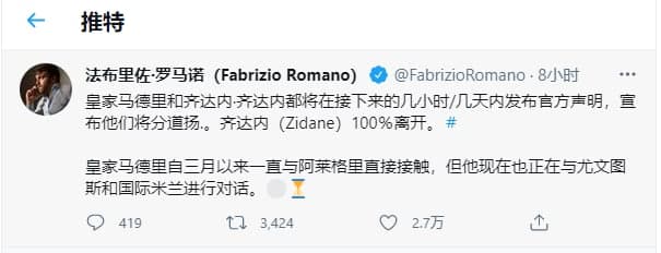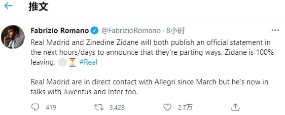 著名新闻记者罗伯诺(Fabrizio Romano)5月27号发言:皇马俱乐部将会在未来几天内官宣齐达内的离开。