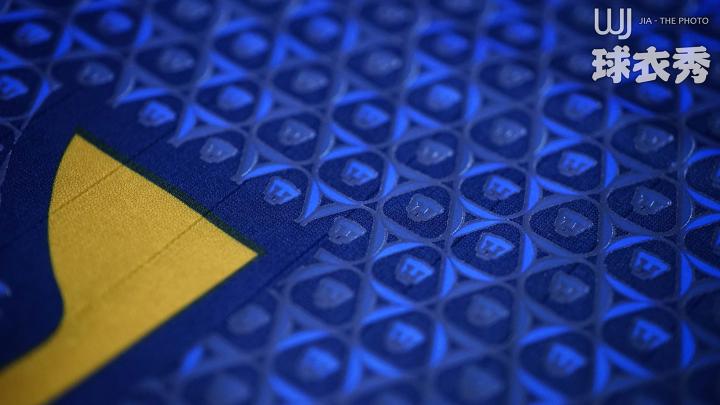 ↑球队队徽以超大尺寸印在球衣胸前,并由无数不同色调的小队徽形成立体效果。