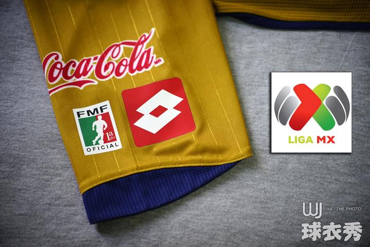 ↑双臂均有广告赞助商及球衣赞助商乐途的logo,而右臂还包括墨西哥足球甲级联赛标志(图右为新的联赛标志)。