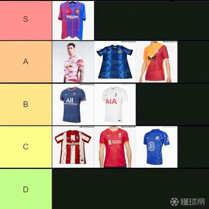 外媒评选最好看的足球俱乐部球衣:巴萨S级独一档。...皇马新星小小罗 @懂球帝2021-05-28 16:24外媒评选最好看的足球俱乐部球衣: 巴萨S级独一档。 莱比锡红牛icon,国米,加拉塔萨雷A级,第二档。 巴黎圣日耳曼和热刺B级,第三档。 马竞,利物浦,切尔西C级第四档。 其他所有俱乐部为为D级,最低档。 你认同吗?展开更多