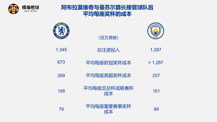 单纯看欧冠赛场上的花钱效率,酋长自然逊色一筹。不过如果把范围扩大到其他赛事上,蓝月亮底气就足多了。自金主接手以来,两队同获得了5次英超冠军和8次国内杯赛冠军,可谓旗鼓相当。