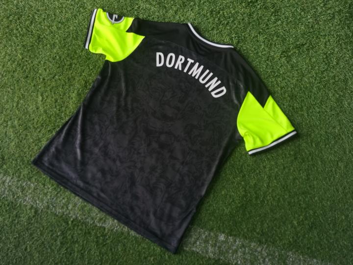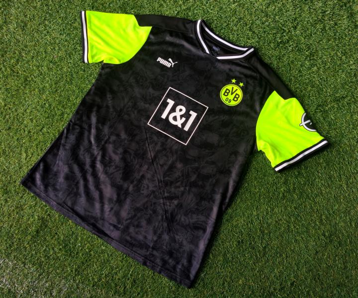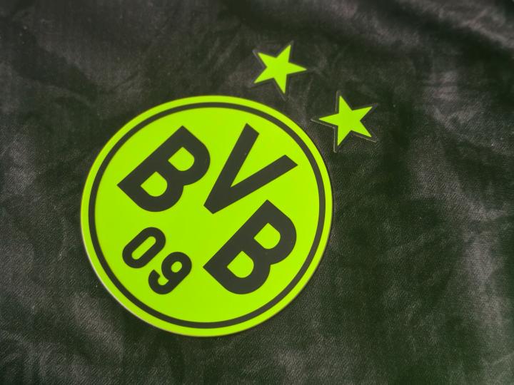球衣内盒也出现了三大赞助商PUMA(彪马)、1&1(1&1电信公司)及OPEL(欧宝汽车)的图标。黑色的球衣上除了呈现类似迷彩灰的名宿群像印花之外,肩膀上拼接了荧光黄的配色,可以说是完美致敬了元年球衣的框架设计。胸前PUMA logo再次与美洲狮图形标同时呈现,而材质和队徽和胸前广告一样,都采用了质感极佳的硅胶材质。手臂上的OPEL汽车广告采用了烫印的材质,球衣背面也照旧烫印上了多特蒙德的队名。