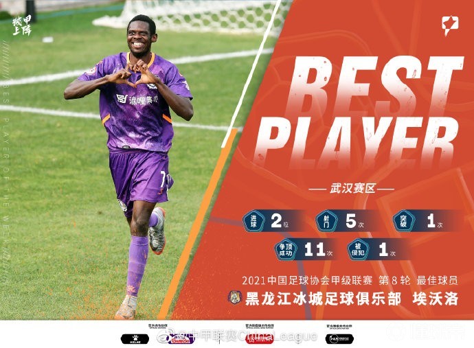 黑龙江冰城球员埃沃洛,在第8轮比赛里5次射门打进2球,还有11次争顶成功,1次突破和1次被侵犯,前场作用明显。