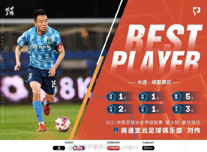南通支云球员刘伟,第8轮比赛的数据为1个进球,1次抢断,5次解围,2次封堵,1次拦截和3次争顶。他帮助球队赢得比赛,登顶大连赛区。