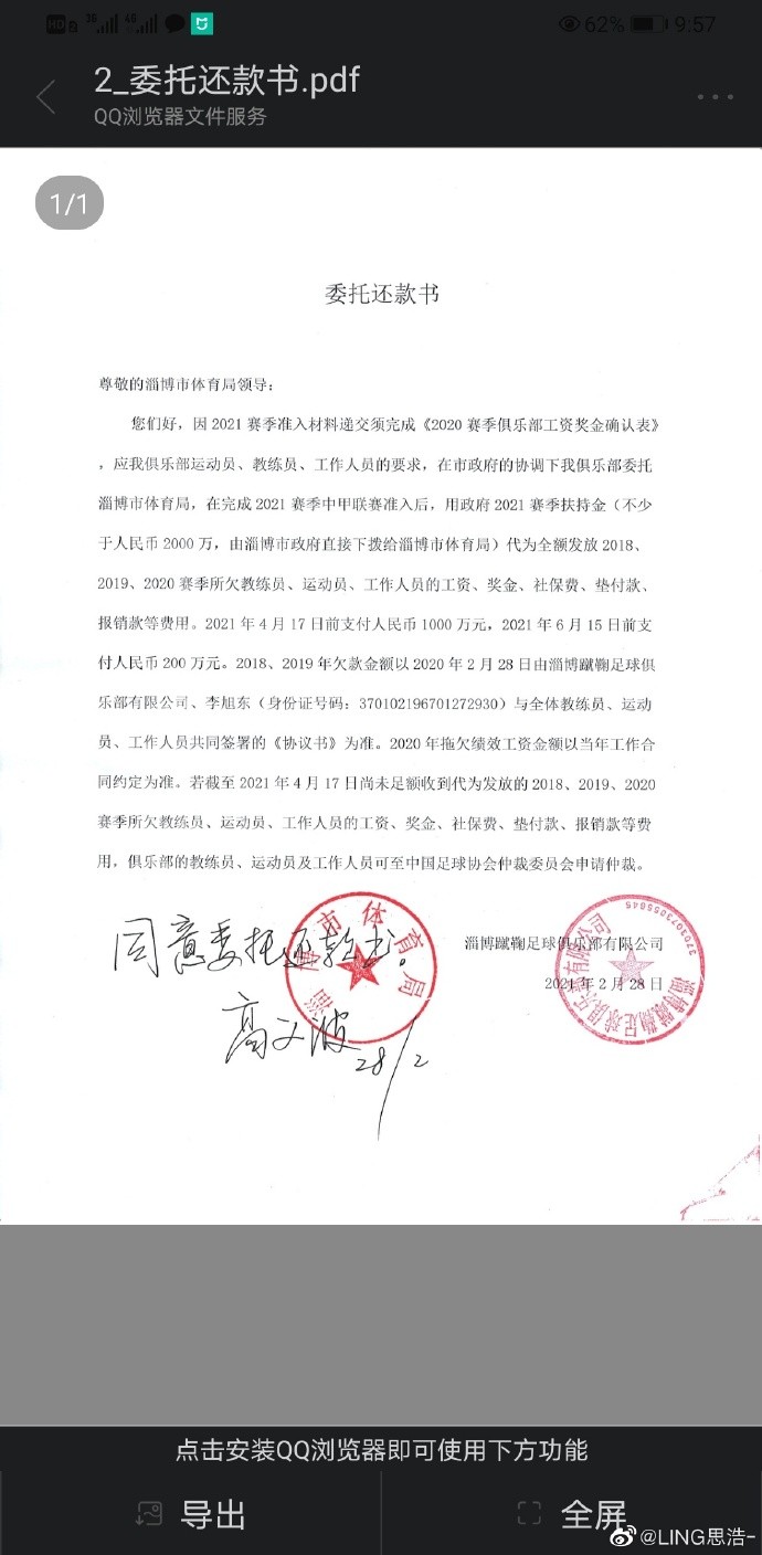 前淄博球员凌思浩发文,晒出了一张委托还款书,并写道:“本来不想说。确实生活过不下去了,体谅。”根据还款书显示,俱乐部应该在4月17日前委托体育局发放1000万元,6月15日前发放200万元,以偿清2018年至今的相应欠款。