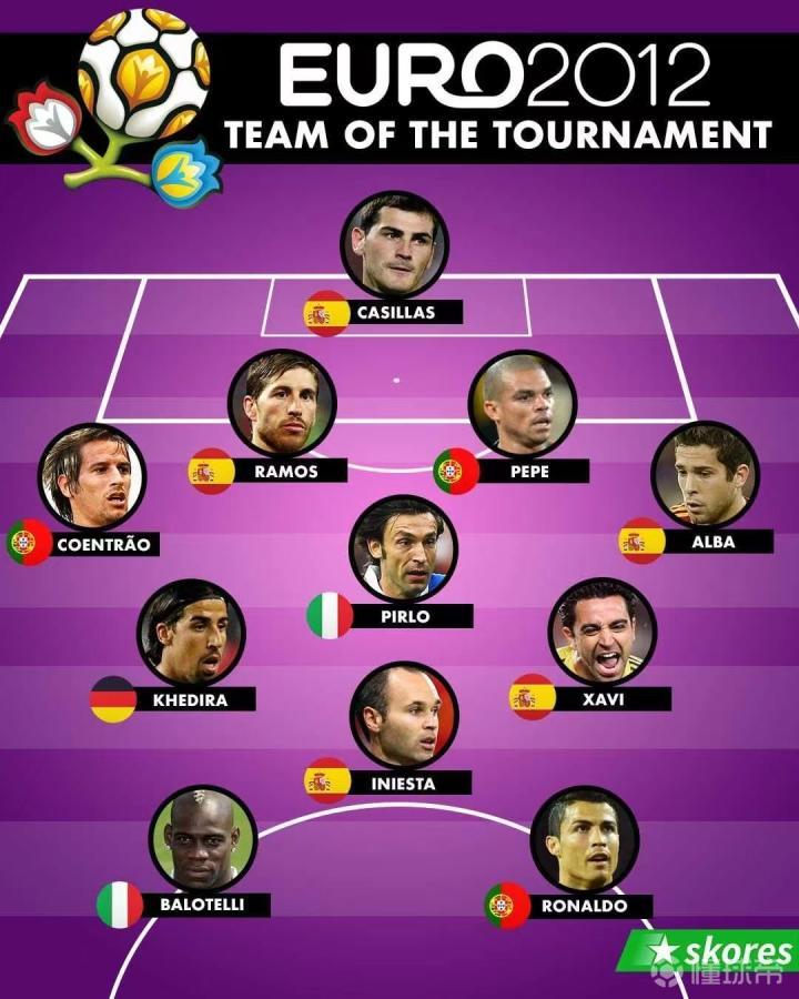 2012年的欧洲杯最佳阵容:前锋:巴洛特利、C罗...Verdy足球回忆 @懂球帝2021-06-04 22:092012年的欧洲杯最佳阵容: 前锋:巴洛特利、C罗 中场:伊涅斯塔、赫迪拉、哈维、皮尔洛 后卫:科恩特朗、拉莫斯、佩佩、阿尔巴 门将:卡西利亚斯 时光飞逝,一晃而过已经9年前,如今依然活跃在顶级联赛的,就只剩下C罗、拉莫斯和阿尔巴了。展开更多