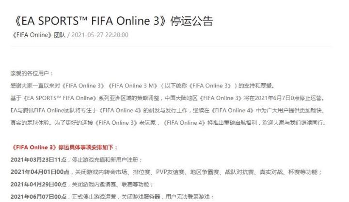 北京时间6月7日,FIFA Online 3将正式停止运营,这款陪伴中国玩家多年的足球游戏终于告一段落。