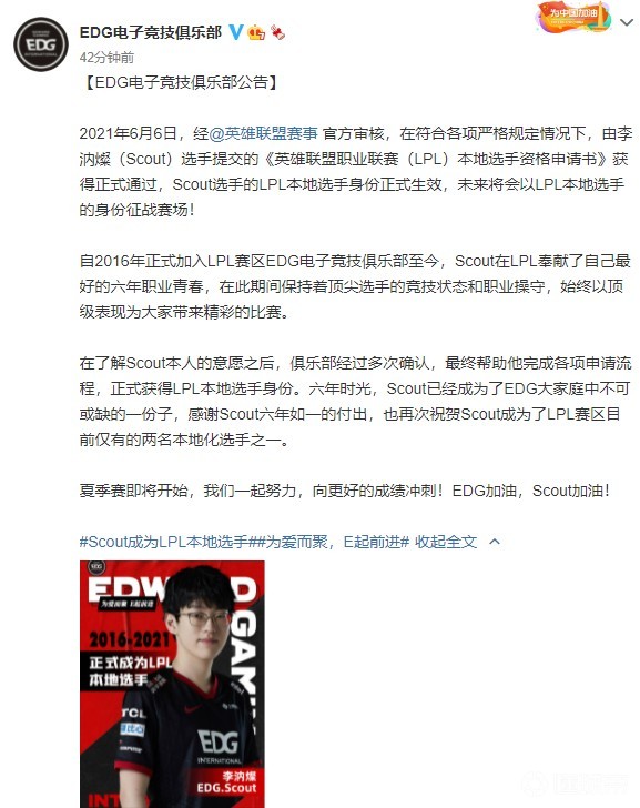 在了解Scout本人的意愿之后,俱乐部经过多次确认,最终帮助他完成各项申请流程,正式获得LPL本地选手身份。六年时光,Scout已经成为了EDG大家庭中不可或缺的一份子,感谢Scout六年如一的付出,也再次祝贺Scout成为了LPL赛区目前仅有的两名本地化选手之一。