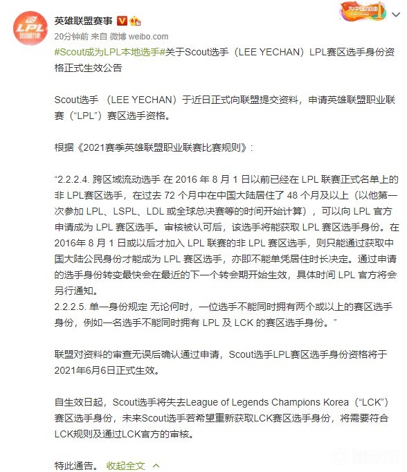 联盟对资料的审查无误后确认通过申请,Scout选手LPL赛区选手身份资格将于2021年6月6日正式生效。
