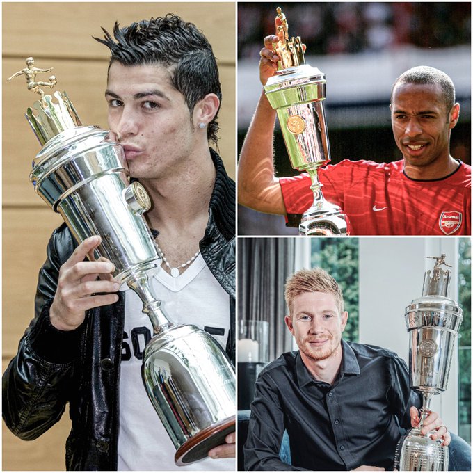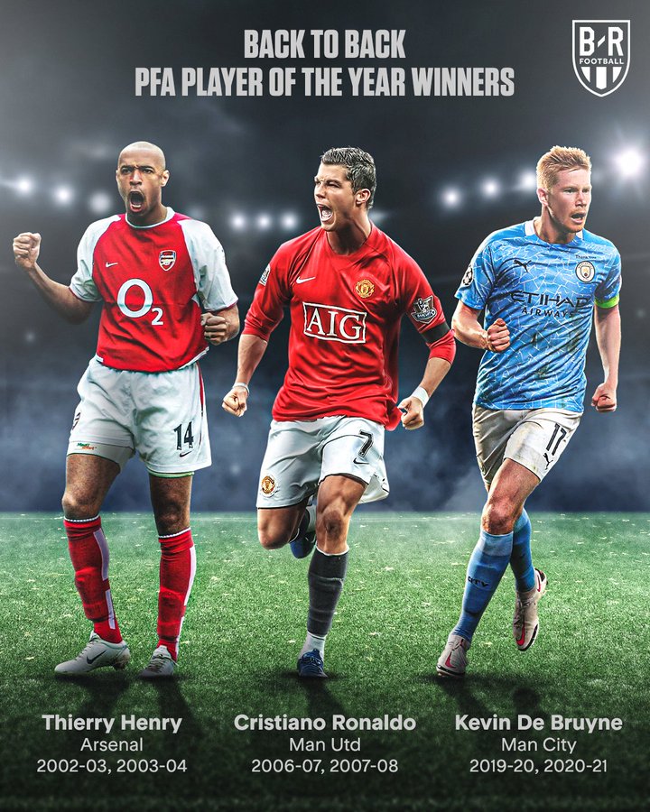Manchester City talisman Kevin De Bruyne has emulated Cristiano Ronaldo and Thierry Henry by scooping the PFA Player of the Year award for a second successive year.