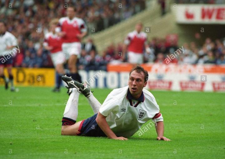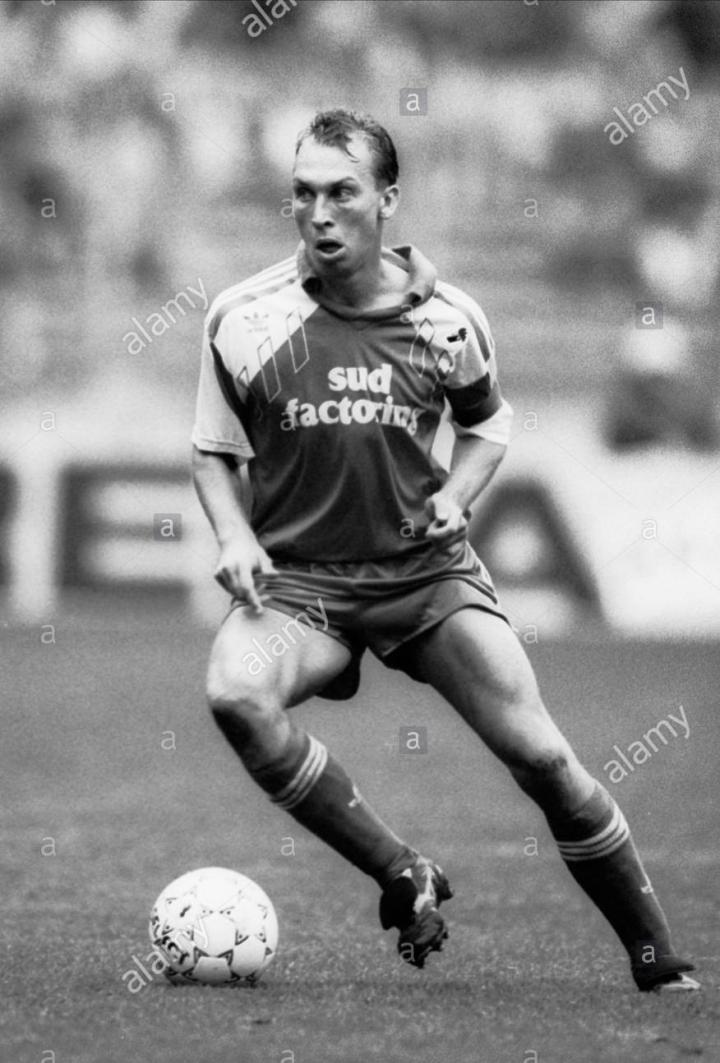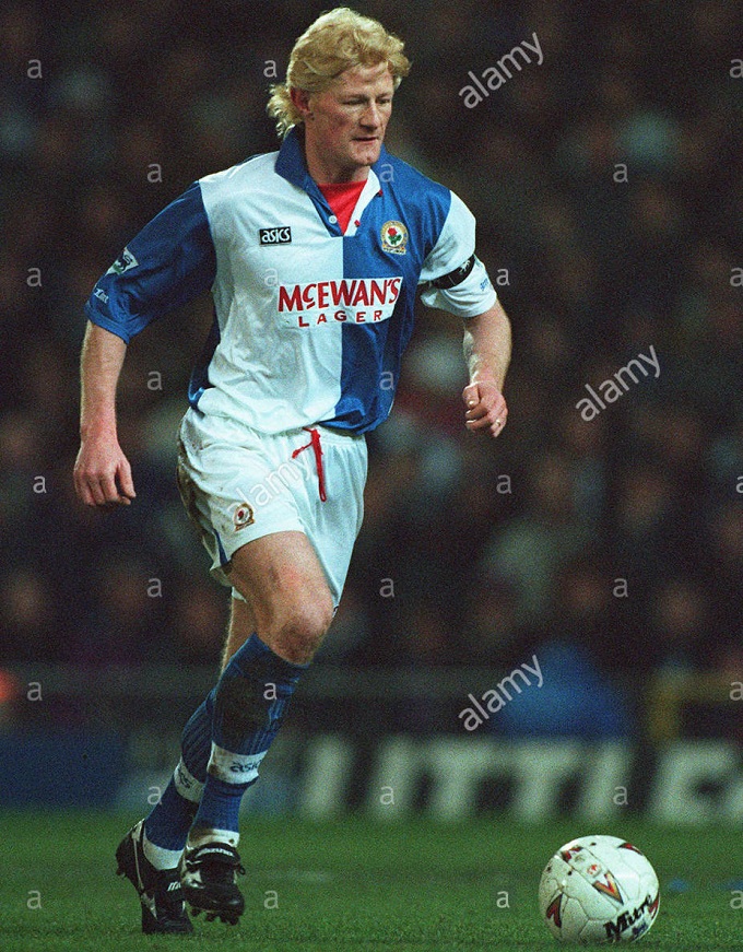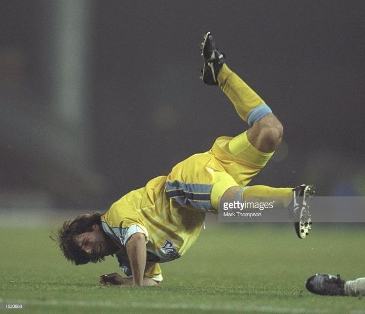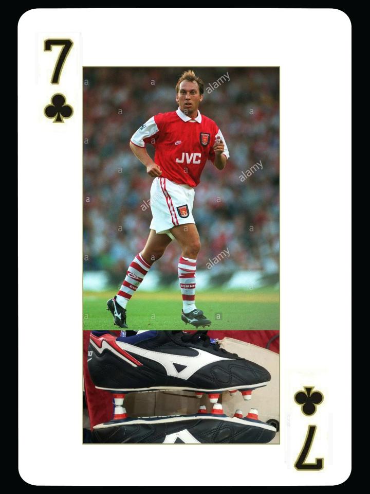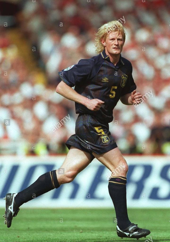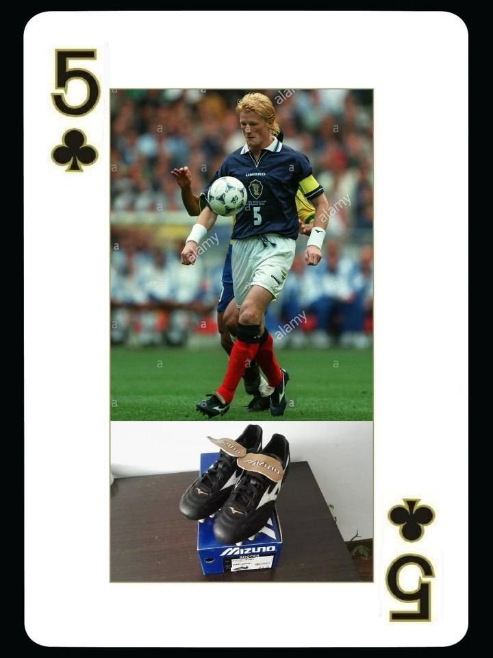 下面这位虽然没有效力过豪门但应该很多人记得,苏格兰队长亨德利。他是英国足坛有名的硬汉,曾经在布莱克本获得英超冠军,是苏格兰最优秀的中后卫,1998年世界杯,他负责防守外星人罗纳尔多,他的正面防守非常出色,但是转身较慢。1996年欧锦赛,被加斯科因挑球过人后破门,是亨德利最尴尬的经历。他的职业生涯基本都使用美津浓球鞋,图中的是1998年的grandeza2代,这双鞋有一个棕色的鞋舌非常特别。