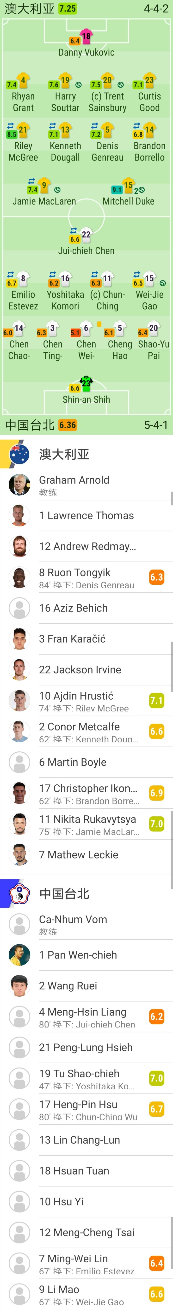 澳大利亚首发:18-武科维奇、14-博雷洛(63`17-伊孔诺米蒂斯)、13-杜格尔(64`2-梅特卡夫)、15-米切尔-杜克、5-让罗(86`8-通吉克)、23-古德、4-格兰特、9-杰米-麦克拉伦(74`11-卢卡维奇亚)、21-麦格里(74`10-赫鲁斯蒂奇)、19-苏塔、20-塞恩斯伯里