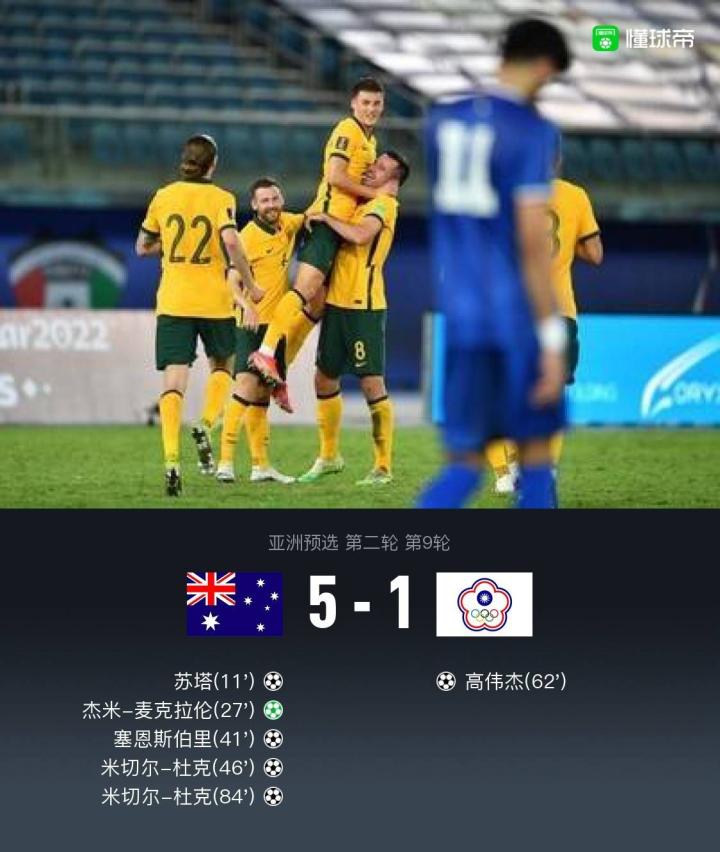 北京时间6月8日03:00,世预赛亚洲区40强赛B组第9轮继续进行,澳大利亚对阵中国台北。上半场,苏塔与塞恩斯伯里先后通过角球机会头球建功,杰米-麦克拉伦造点并亲自操刀命中。下半场,米切尔-杜克头顶脚踢完成梅开二度,高伟杰推射破门为中国台北扳回一城。最终,澳大利亚5-1轻取中国台北。