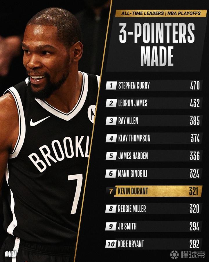 杜兰特半场投中3个三分球砍下21分,升至NBA季后赛三分榜第7 后仰上篮 后仰上篮2021-06-08 08:50杜兰特半场投中3个三分球砍下21分,超越雷吉-米勒升至NBA季后赛三分榜第7名。杜兰特半场投篮10中7,三分4中3,砍下21分3篮板2助攻。与此同时杜兰特NBA季后赛三分球命中数达到了321个,超越雷吉-米勒升至NBA季后赛三分榜第7名。展开更多