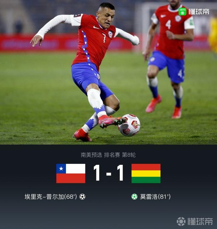 智利1-1玻利维亚,普尔加头球破门,莫雷洛点射扳平
