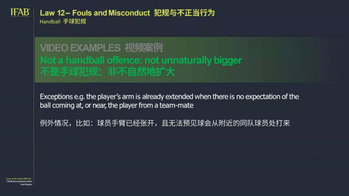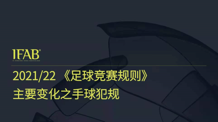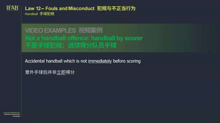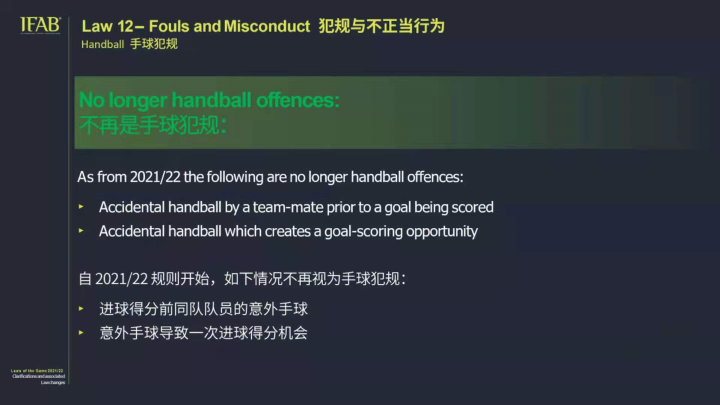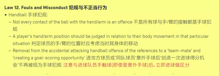 IFAB 官方给出的 “手球犯规” 调整为:注意与进球队员手触球(即使是意外手球)后,立即进球做区分。