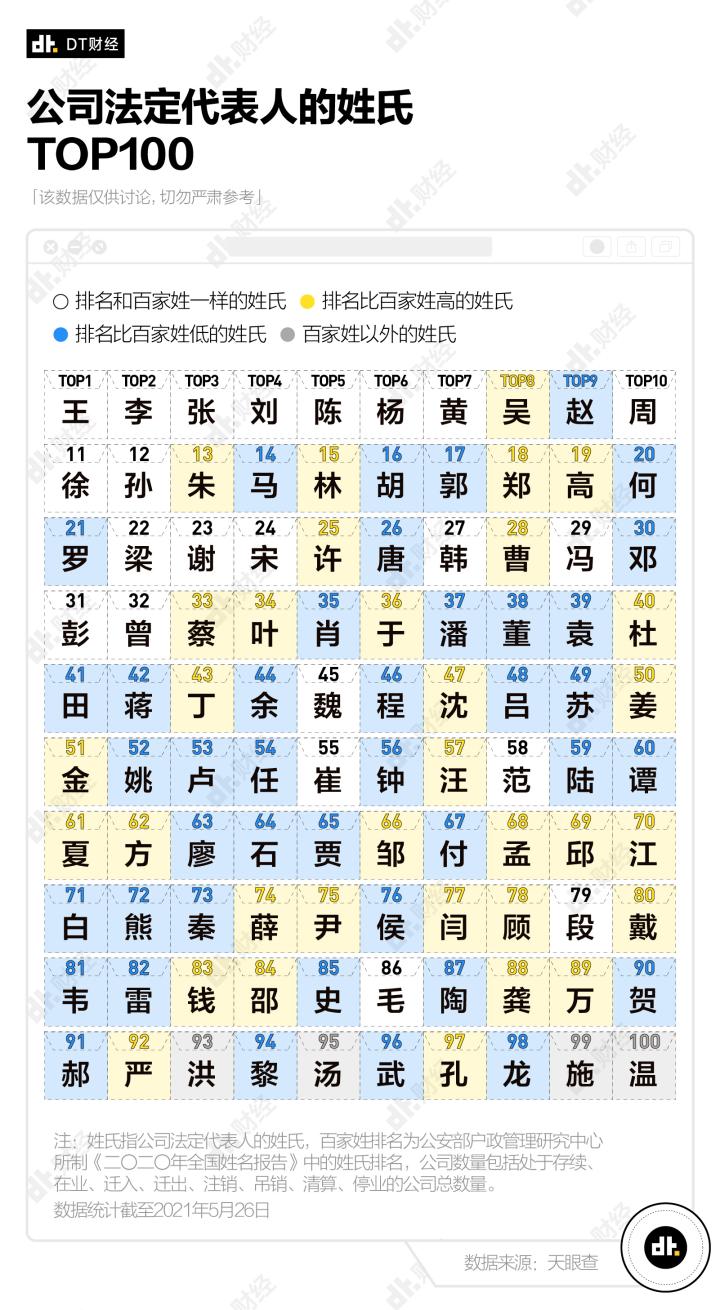 参照百家姓的优良传统,我们也按照各个姓氏担任过法定代表人的公司数量,排出了公司法定代表人的姓氏TOP100。