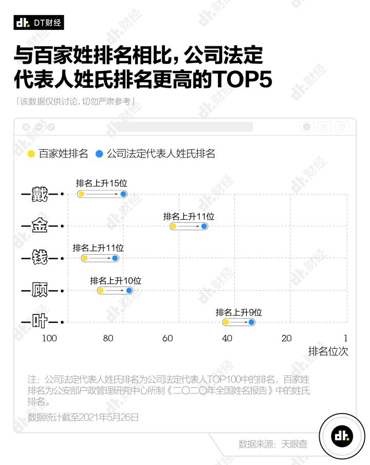 比百家姓排名高出最多的5个法定代表人姓氏分别是:「戴」「金」「钱」「顾」「叶」。