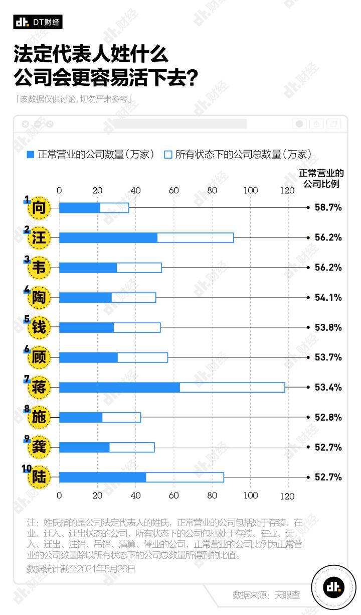 从目前还在正常营业的公司数量占比来看,「向」「汪」「韦」「陶」「钱」的表现不错,排在前五名。这些姓氏的老板开过的公司数量不一定多,但有超过一半公司还在正常运转,意味着他们的运营能力还不错,即使不是一帆风顺,也不至于今天刚开业,明天就在街边跳楼大甩卖。