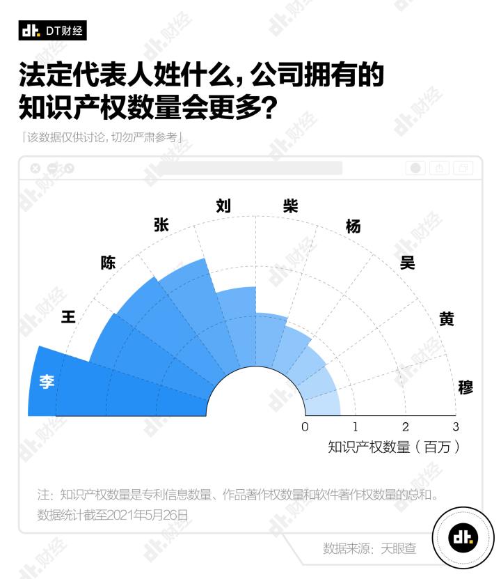 另外,从知识产权如专利信息、作品著作权、软件著作权的数量来看,「柴」和「穆」这两个小众姓氏势头很猛,直接冲进拥有知识产权数量最多的姓氏榜单前10名,分别位列第6和第10。