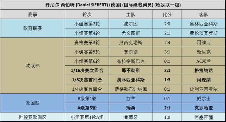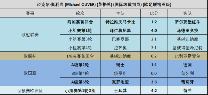 (图)奥利弗本赛季执法的国际赛事场次统计
