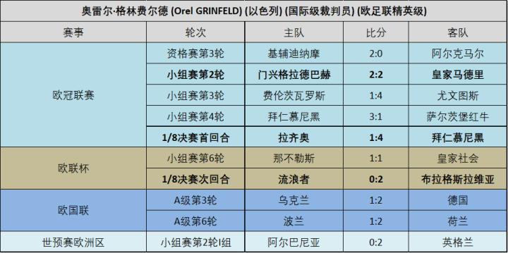 格林费尔德生于1981年8月21日,现39岁,于2012年成为国际级裁判员,19年年底与温契奇和科瓦奇一同晋升至精英级,本赛季执法了门兴与皇马的欧冠小组赛焦点战,同时还首次获得了执法欧冠淘汰赛的机会,执法了1/8决赛首回合拉齐奥与拜仁的较量,表现不俗,他也将成为近年来首位参与国际大赛执法的以色列裁判员。