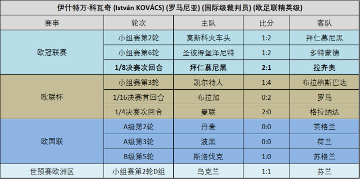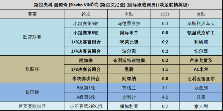 (图)科瓦奇本赛季执法的国际赛事场次统计