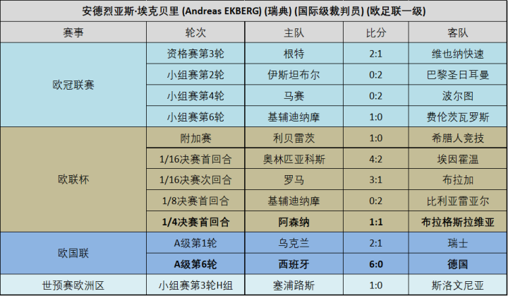 (图)埃克贝里本赛季执法的国际赛事场次统计