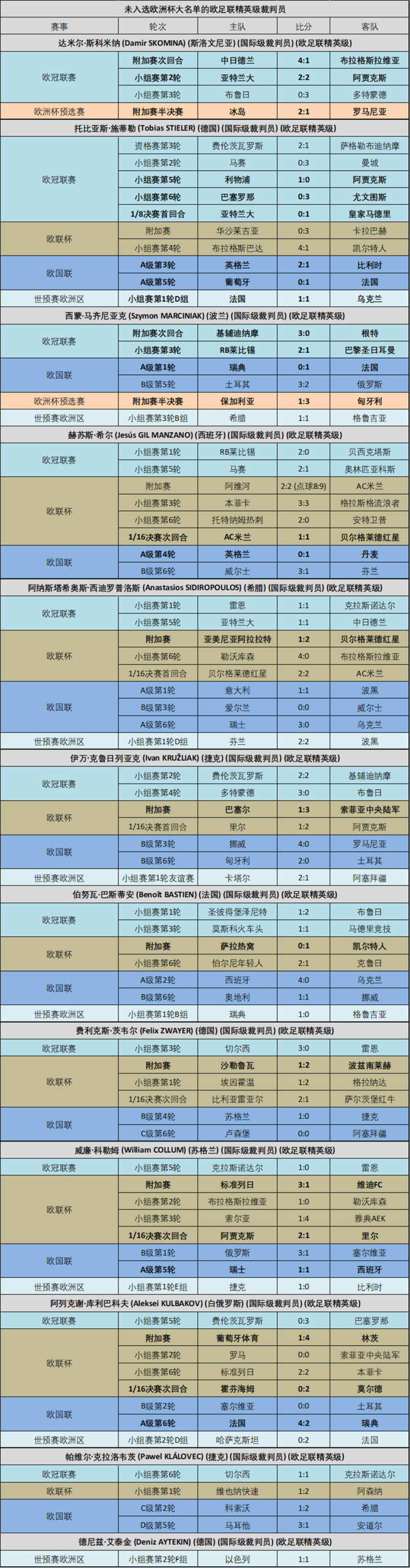 同样落选的还有曾经的“欧足联亲儿子”——波兰名哨马齐尼亚克,此前无论他的执法表现有多么不忍直视,都一直能够受到欧足联与国际足联的青睐,今年有传闻称其心脏功能出现了问题,所以没能执法太多比赛,从而导致欧洲杯的落选。