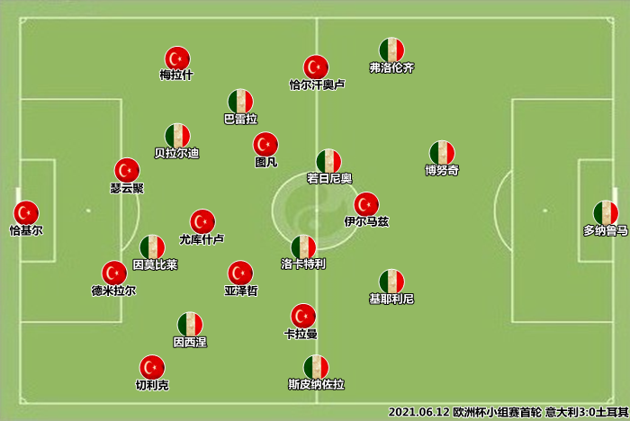 首战实力不俗的土耳其,曼奇尼沿用了一周前对阵捷克时的首发阵容。
