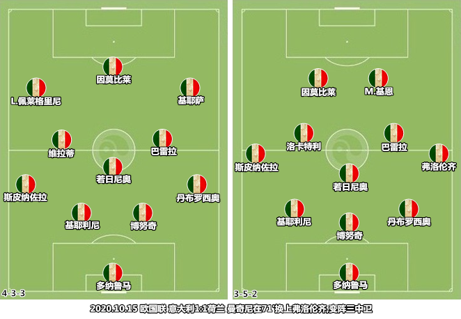洛伦佐-佩莱格里尼和森西退出,维拉蒂的身体状态还不适合参与比赛,曼奇尼迅速推出了一套全新的中前场组合,贝拉尔迪和洛卡特利抓住机会锁定了主力位置,基耶萨和贝洛蒂被留作后手。