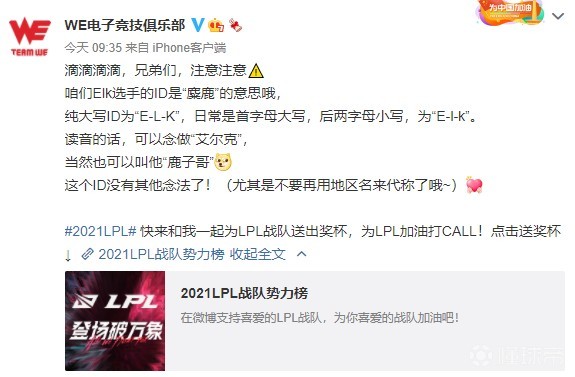 峡谷全视野昨日英雄联盟LPL夏季赛WE 2-1战胜SN,赛后WE官博:滴滴滴滴,兄弟们,注意注意咱们Elk选手的ID是“麋鹿”的意思哦。