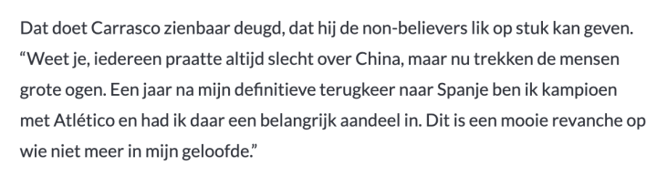 小编找到了原文采访,采访中卡拉斯科还说了这样一段话:“你知道,过去每个人都说中国不好,说他们的坏话,但是在我回到西班牙一年后就跟随马竞赢得了西甲冠军,我在球队夺冠过程中扮演了重要的角色。对于质疑我的人来说,这就意味着一次复仇。”