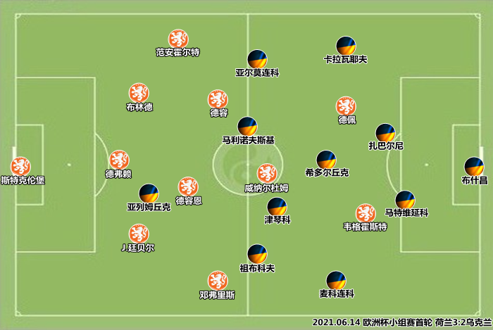威纳尔杜姆积极寻求对抗,发挥擅长护球和衔接的特点,德佩不断沿左肋部带球冲击乌克兰的防线,韦格霍斯特靠前压制防线,掩护身后的队友……在这个以中锋为轴心的进攻体系中,德容周围的压力被来自各个方向的队友所稀释,总能获得正面持球发动进攻的机会,这是荷兰队能够持续组起攻势的原因。