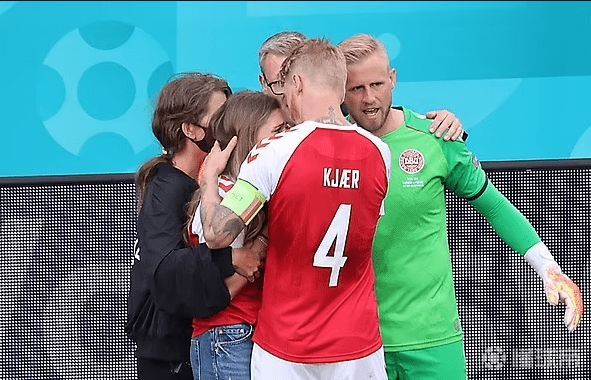 当时,心急如焚的Sabrina从看台跑到了场地内,却无法靠近埃里克森,小舒梅切尔和丹麦队长克亚尔不断安抚她的情绪,这些都被镜头记录下来。
