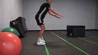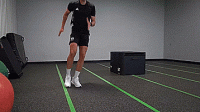 第二个练习是继续热身的好方法,这个练习会加大小腿和股四头肌的负荷,同时也可以训练我们的平衡能力,我们沿着对角线从一边跳跃到另一边,注意,到当我们着地的时候,我们需要弯曲膝盖来加以缓冲。然后把力量加到这条腿,沿着45度向相反方向跳跃。
