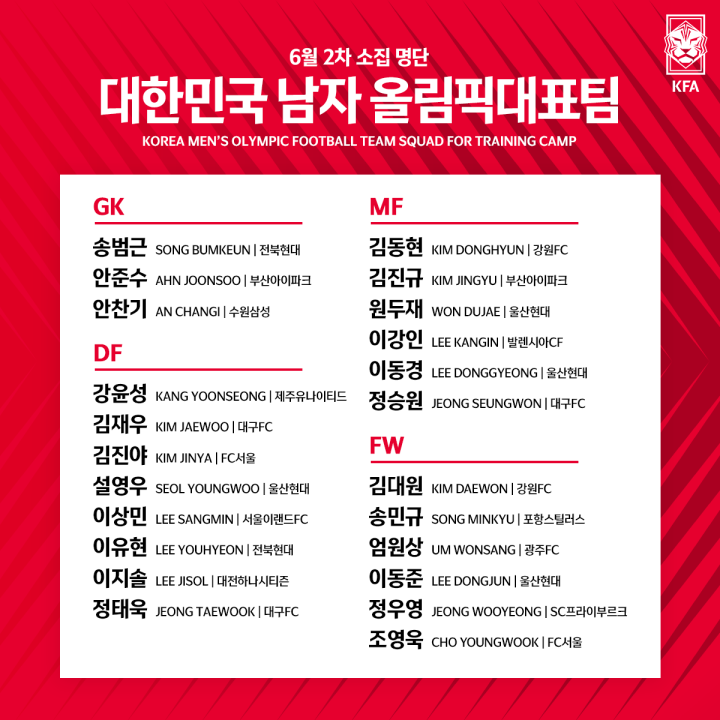 FW:郑优营(弗莱堡【德甲】),严原上(光州FC),曹永旭(FC首尔),金大元(江原FC),李东俊(蔚山现代),松旻揆(浦项铁人)