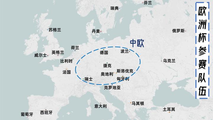 中欧一共有9个国家,除袖珍国家列支敦士登和常常被划入巴尔干地区的斯洛文尼亚以外,另外7个国家都将参加本届欧洲杯正赛,分别是波兰、捷克、斯洛伐克、匈牙利、奥地利、德国和瑞士,几乎占到所有参赛国家的三分之一。