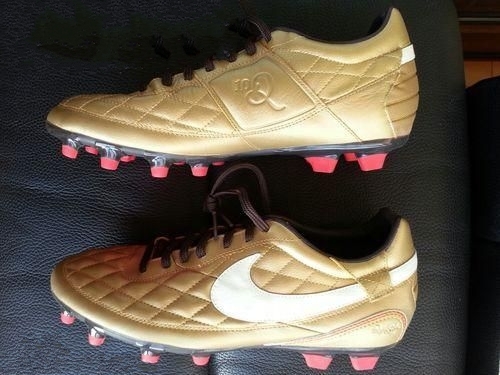 接下来的金靴来头可就大了,虽然是量产,但也是一鞋难求,那就是2004年nike的mv2 r9金色,俗称金刺,虽然这款鞋当年是r9专属配色,不过很多球星还是无法抵挡金靴的诱惑,都有使用,包括c罗等。