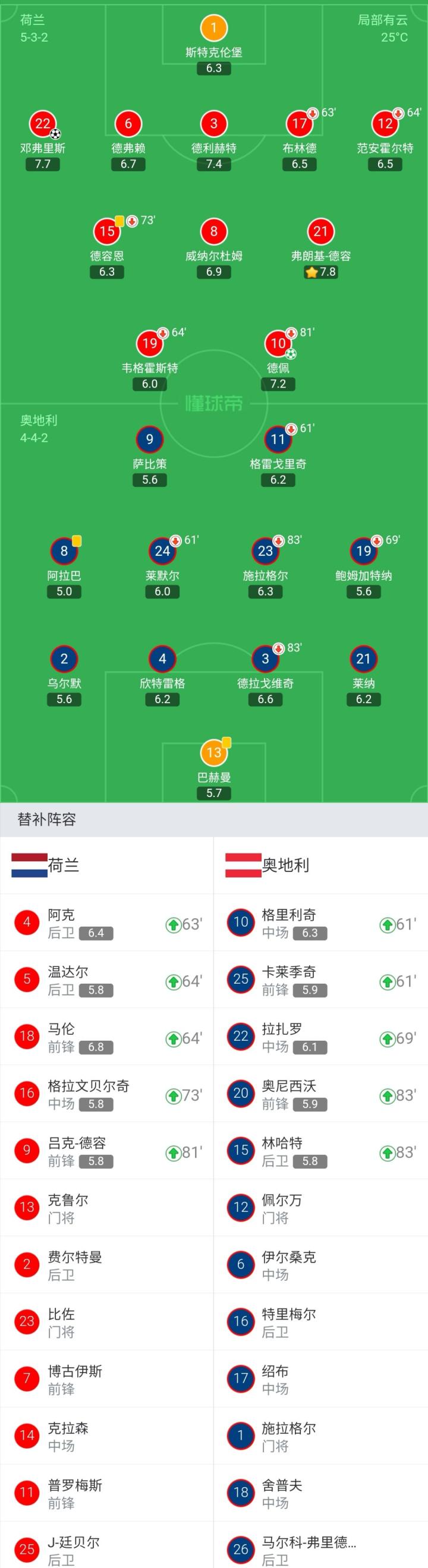 荷兰首发:1-斯特克伦堡、3-德利赫特、6-德弗赖、17-布林德(63`4-阿克)、22-邓弗里斯、12-范安霍尔特(64`5-温达尔)、15-德容恩(73`16-格拉文贝尔奇)、21-弗朗基-德容、8-威纳尔杜姆、19-韦格霍斯特(64`18-马伦)、10-德佩(81`9-吕克-德容)