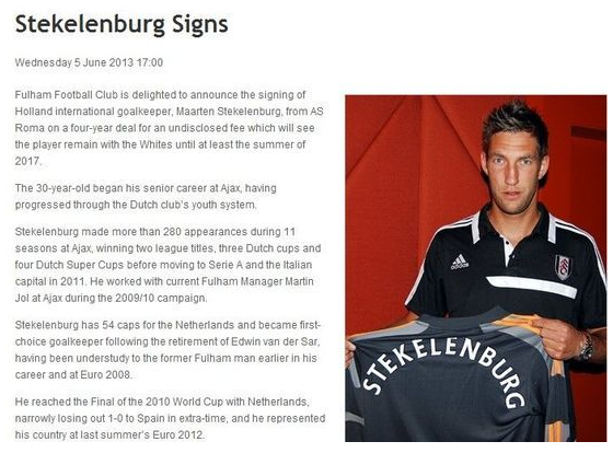 离开罗马后,大斯转会至英超富勒姆,但斯特克伦堡首秀就不幸受伤,最终荷兰人只为伦敦球队上场21次,富勒姆也随之降级,糟糕的状态让斯特克伦堡落选了代表荷兰参加巴西世界杯。